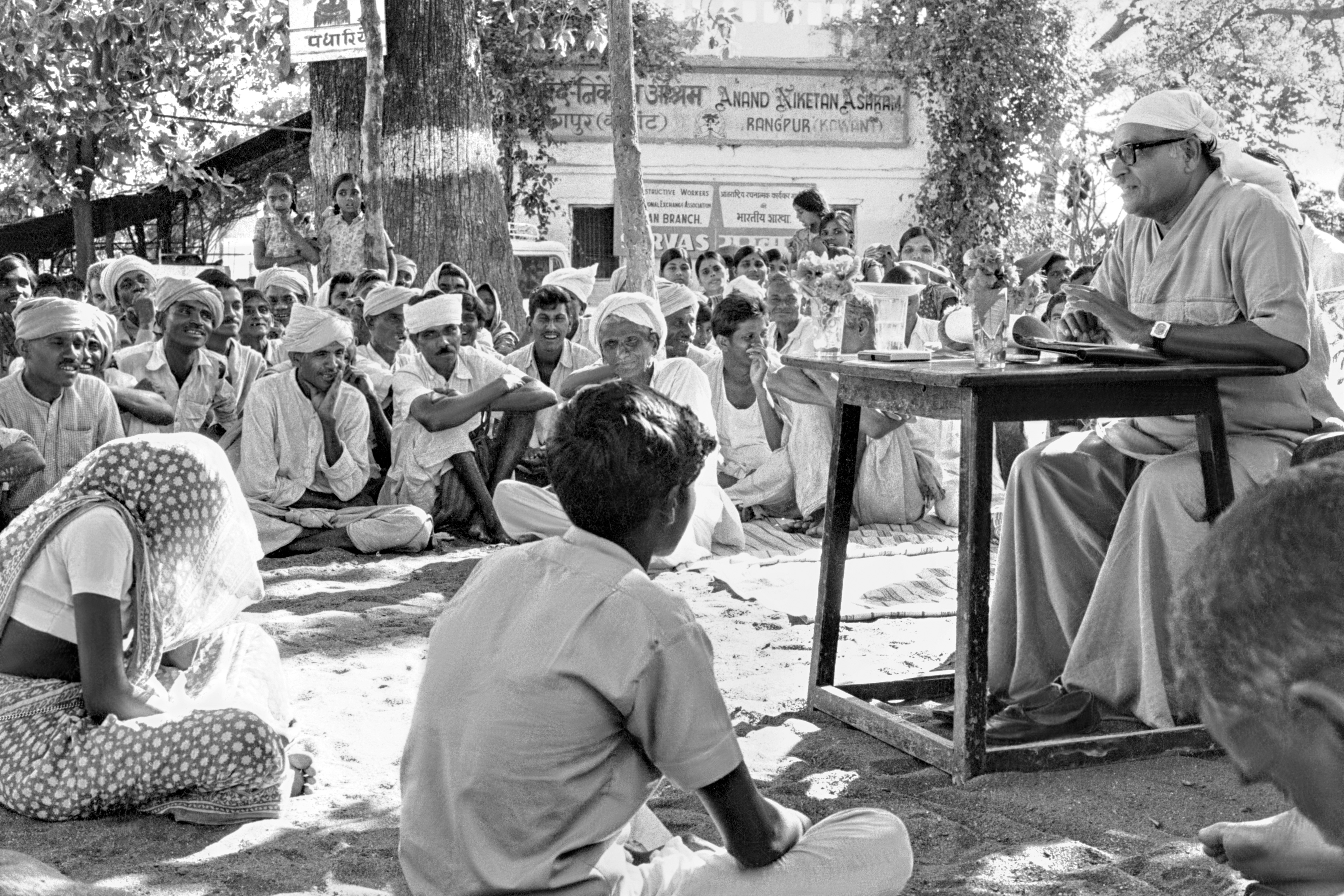 The man hearing her case was short and stocky, with loose tan clothing and a white kerchief over his hair. He sat at a small wooden table with papers spread on it, in the shade of a large tree at one edge of a raised-earth platform. Before him and to the sides of him on the platform, sitting on the ground and facing him, were about 200 adivasis—tribal people of an aboriginal race found in many parts of India.